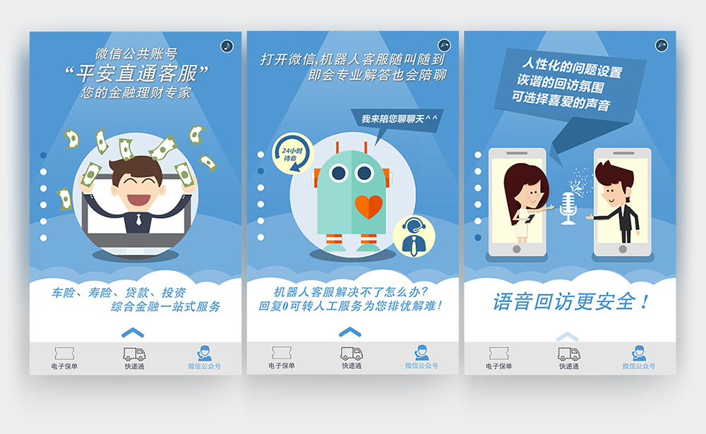 平安直通客服是平安直通保險(xiǎn)公眾賬號(hào)內(nèi),介紹平安直通客服的H5手機(jī)端頁(yè)面。邁若從項(xiàng)目人群及瀏覽習(xí)慣出發(fā),以輕松的卡通形象配合幽默風(fēng)趣的文字,讓瀏覽者快速、便捷的了解平安直通客服的功能及介紹。