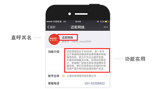 直接以企業名稱或者產品名稱作為微信公眾號的名稱,有利于用戶直接搜索關注。