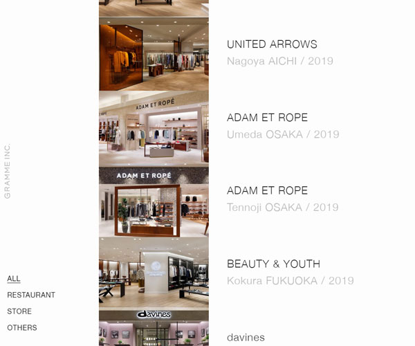 Gramme在多地開設精美的服飾店,網站的排版方式標新立異,左右固定的文字形式